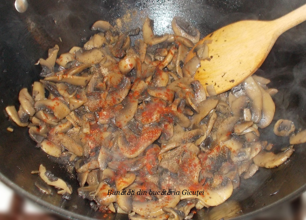 Curatam ciupercile si piciorusele acestora. Daca este nevoie le trecem sub un jet de apa rece, apoi le lasam la scurs sau le tamponam cu servetele. Le taiem in felii potrivit de mari.