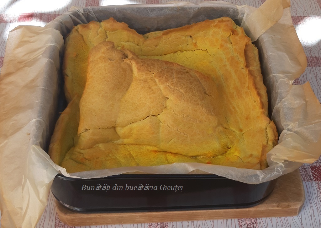 Tapetam o tava cu hartie de copt. Eu am folosit o tava cu dimensiunile de 24x24 cm, dar merge foarte bine si una putin mai mare. Transferam aluatul in ea si il intindem intr-un strat cat mai uniform…eu l-am intins cu o racleta/spatula de bucatarie. Ridicam putin aluatul si pe peretii laterali ai tavii.