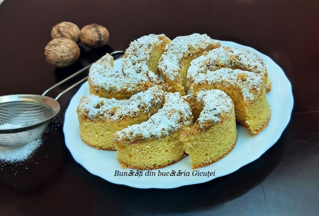 Spargem ouale separand albusurile de galbenusuri. Avem grija sa nu ramana urme de galbenus in albus. Peste albusuri punem un varf cutit de sare si le mixam pana devin o spuma tare, apoi adaugam in doua reprize zaharul si zaharul vanilat. Mixam bine pana de fiecare data pana acestea se dizolva complet si se formeaza o bezea tare si lucioasa. Peste galbenusuri turnam in fir subtire untul topit amestecand continuu cu telul in forma de para. Cu ajutorul unei spatule de bucatarie incorporam in bezea mixtura de galbenus si unt, amestecand cu miscari largi, de jos in sus. La sfarsit incorporam faina cernuta, amestecand la fel, cu miscari largi si de jos in sus. Transferam aluatul in tava pregatita dinainte si il nivelam. Deasupra presaram in strat uniform miezul de nuca. Introducem tava in cuptor si lasam prajitura sa se coaca timp de aproximativ 40 de minute sau pana se rumeneste usor. Dupa primele 35 de minute putem face testul cu scobitoarea: infigem o scobitoare in mijlocul prajiturii… daca iese curata, fara aluat prins de ea, inseamna ca este coapta. Daca nu, mai lasam cateva minute prajitura in cuptor si repetam testul. Cand este gata, scoatem tava cu prajitura din cuptor, iar cand se racoreste o scoatem din tava cu hartie cu tot. Cand se receste complet o pudram cu zahar, apoi cu marginea unei forme rotunde sau a unui pahar decupam bucati in forma de semiluna… vedeti mai jos fotografiile. Asezam prajiturile pe un platou si le servim cu mare pofta alaturi de cei dragi.😊