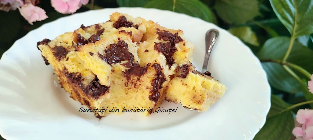La aceasta reteta avem nevoie de o paine mai veche de 1-2 zile pe care o vom taia in cubulete cat mai egale. Eu am avut o franzela, dar se poate folosi paine feliata, bagheta sau orice paine aveti. Cantarim/ masuram toate ingredientele ca sa le avem la indemana. Ungem un vas termorezistent cu jumatate din cantitatea de unt si punem cuburile de paine in el. Spargem ouale intr-un bol, adaugam zaharul si sarea peste ele si le batem bine cu telul in forma de para. Incorporam treptat si laptele, apoi aromatizam cu coaja de lamie, vanilie sau aromele care va plac. Peste painea din vas presaram ciocola, apoi turnam cu polonicul amestecul de oua, zahar si lapte. Apasam usor cu lingura ca sa se imbibe toate cuburile de paine. Daca este nevoie mai putem adauga o cescuta cu lapte pe care o vom distribui uniform. Deasupra rupem untul ramas si il punem ici-colo peste painea imbibata. Punem vasul in cuptorul incins la foc mediu(180-190°C) pentru aproximativ 40 de minute sau pana budinca se rumeneste frumos deasupra. Cand este gata, scoatem tava cu budinca din cuptor si o lasam sa se raceasca. Este buna si calduta, dar mie imi place si mai mult rece. A iesit un deliciu!